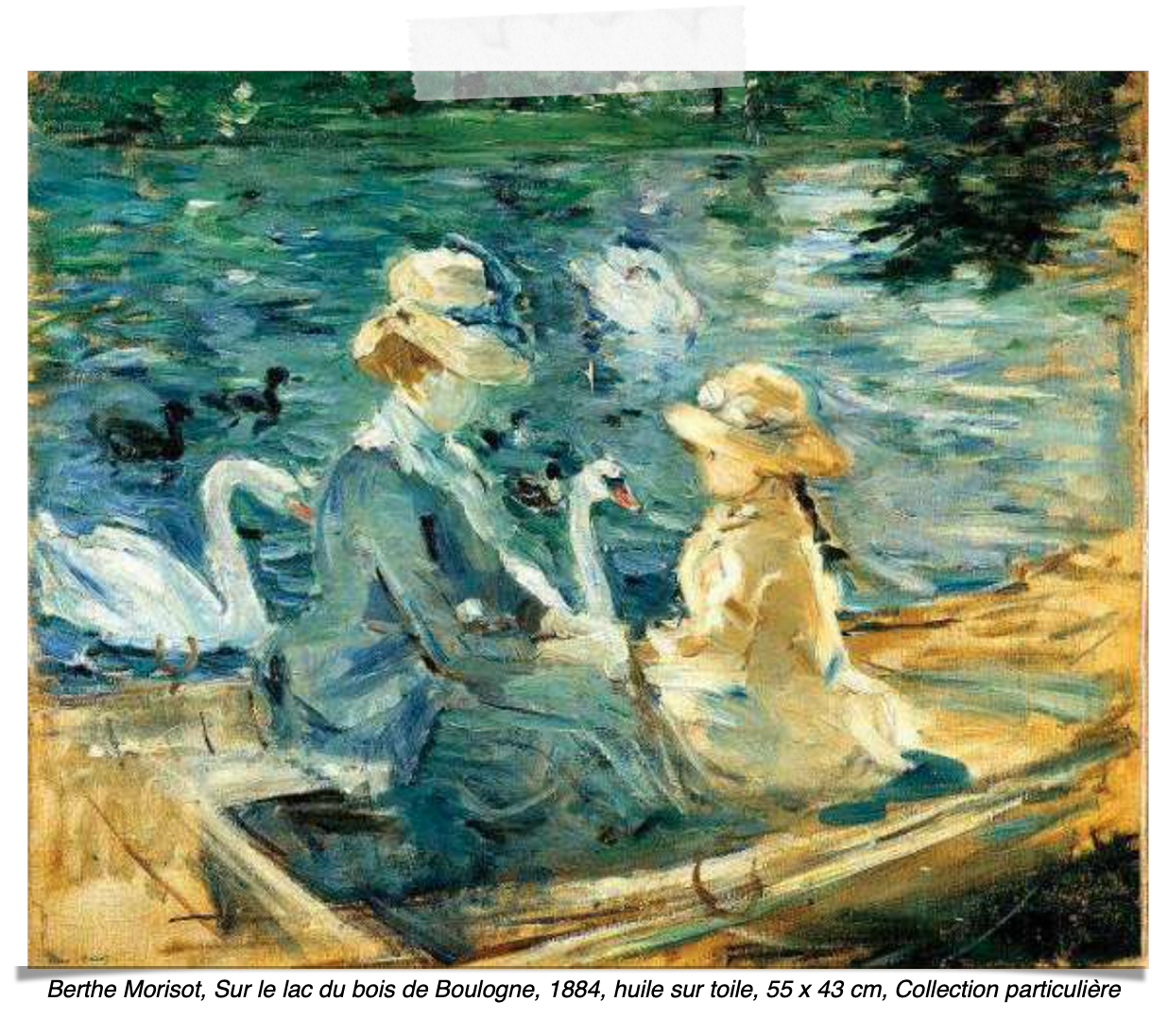 Berthe Morisot dans son œuvre sur le lac du bois de Boulogne illustre la révolution de ce style. L’artiste représente un épisode de la vie moderne, une sortie en bateau entre une mère et sa fille. La composition est très intéressante, elle présente le bateau en hors-champs pour se focaliser sur un moment de complicité mère fille, mêlant la scène entre intérieur et extérieur. Les deux femmes observent les cygnes et les canards partageant un instant ensemble entourées par la nature.