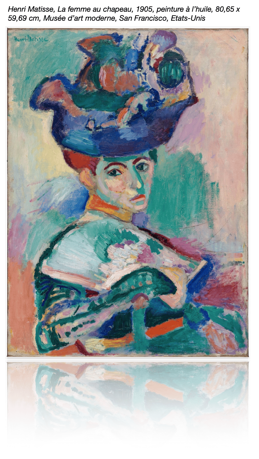 Matisse réalise en 1905 La femme au chapeau. Dans cette toile, l’artiste dépeint le portrait de sa femme d’une manière nouvelle, il se compose exclusivement de couleurs vives. Exposé dans la salle VII du Salon de l’Automne, le public est scandalisé par la proposition du peintre et des autres d’artistes réunis. Le critique d’art Louis Vauxcelles fait référence à une peinture bestiale dans sa célèbre formule “C’est Donatello parmi les fauves” puisqu’un buste est placé au centre de cette salle rebaptisée plus tard “la cage aux fauves”. C’est la naissance du fauvisme.