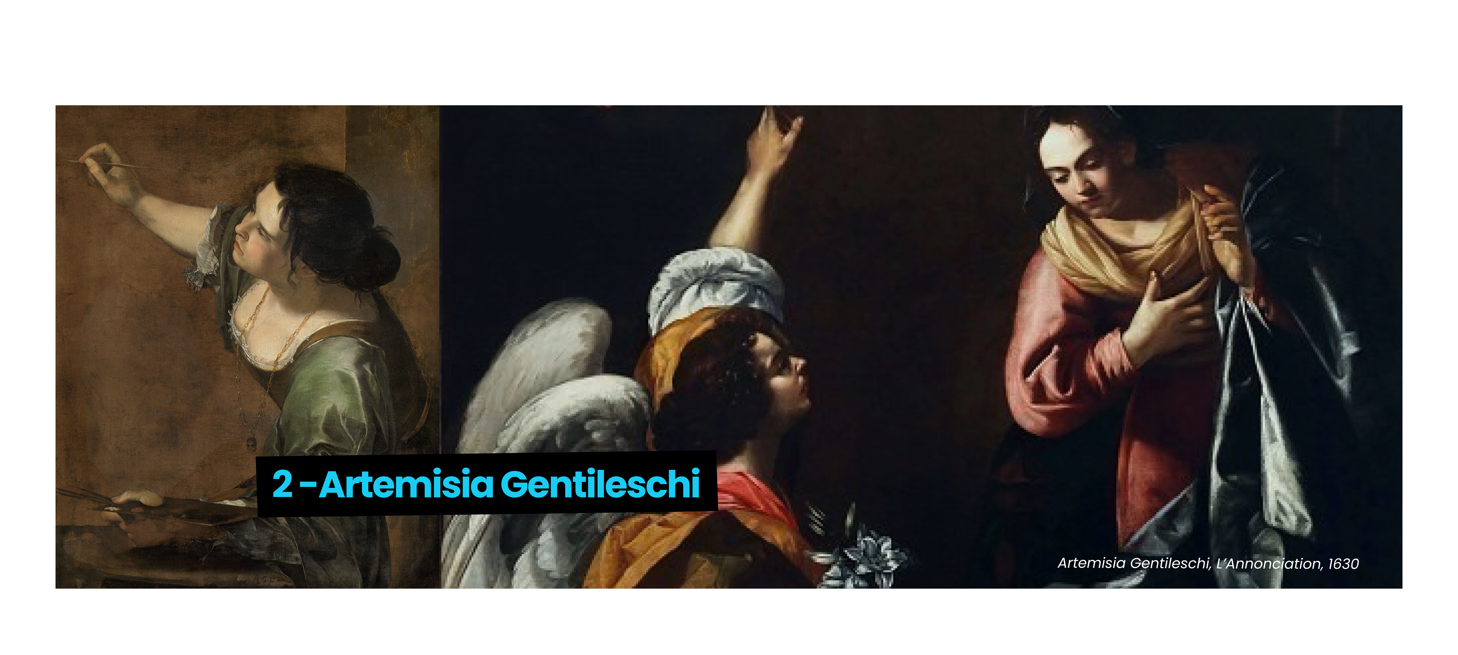 Son père, Orazio Gentileschi, artiste influencé par Caravage, lui enseigne la peinture en découvrant son talent précoce. Le père et la fille collaborent sur plusieurs œuvres importantes. En 1616, Artemisia est admise à l'Accademia del Disegno de Florence, un privilège pour une femme à l'époque. Artiste renommée, elle est estimée par de riches collectionneurs, y compris les rois de France, d’Espagne et d’Angleterre. Femme libre et reconnue, Artemisia ouvre la voie pour les artistes femmes des siècles à venir.