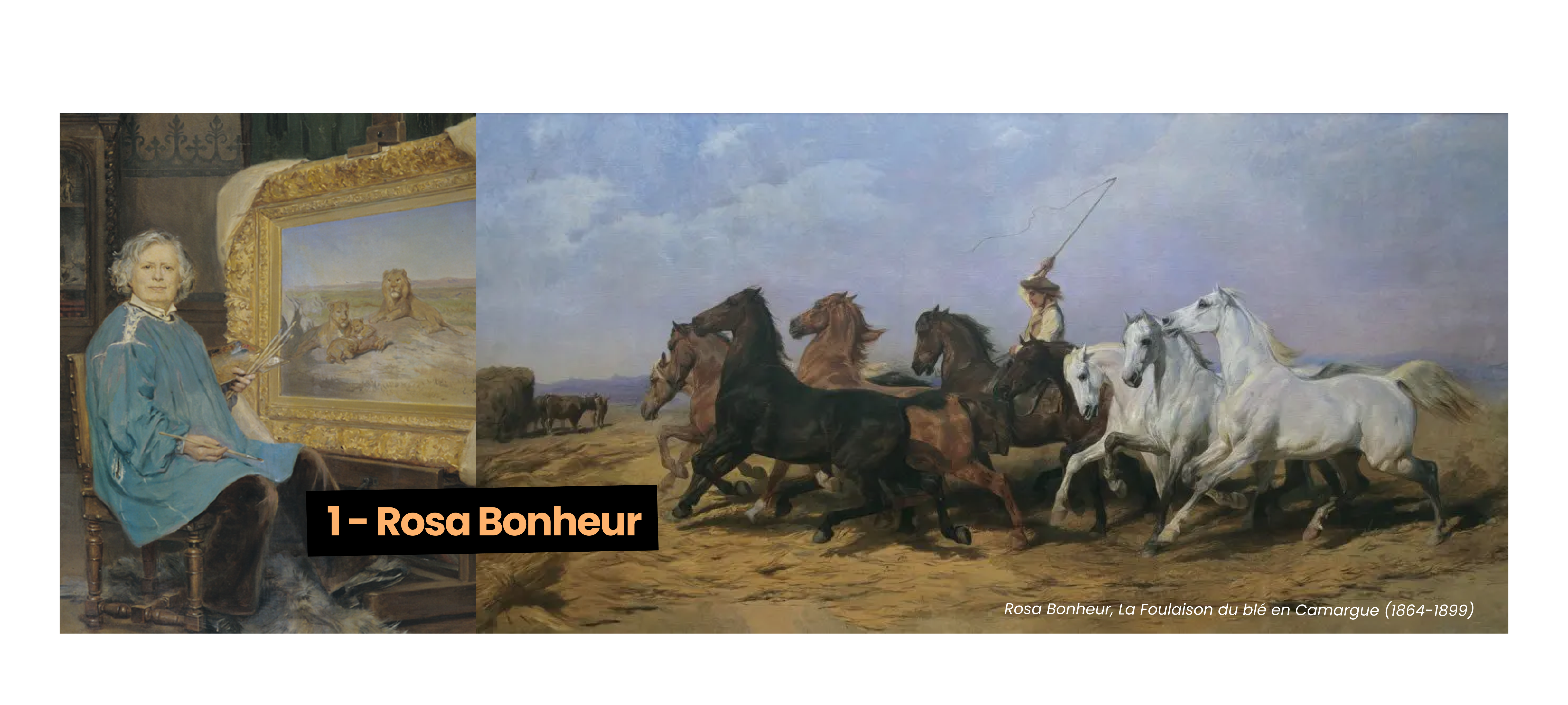 Peintre animalière oubliée, Rosa Bonheur était pourtant une artiste renommée en France, en Angleterre et aux États-Unis durant la seconde moitié du XIXe siècle. Fille de peintre, son père, Raymond Bonheur, l’a formée dès son enfance en reconnaissant son incroyable talent. À l’âge de 14 ans, Rosa Bonheur vit déjà de son art et devient l’une des artistes les plus prisées de son époque. En 1865, elle est la première femme à recevoir la Légion d’honneur, prouvant que le talent n’a pas de genre ni de limite.