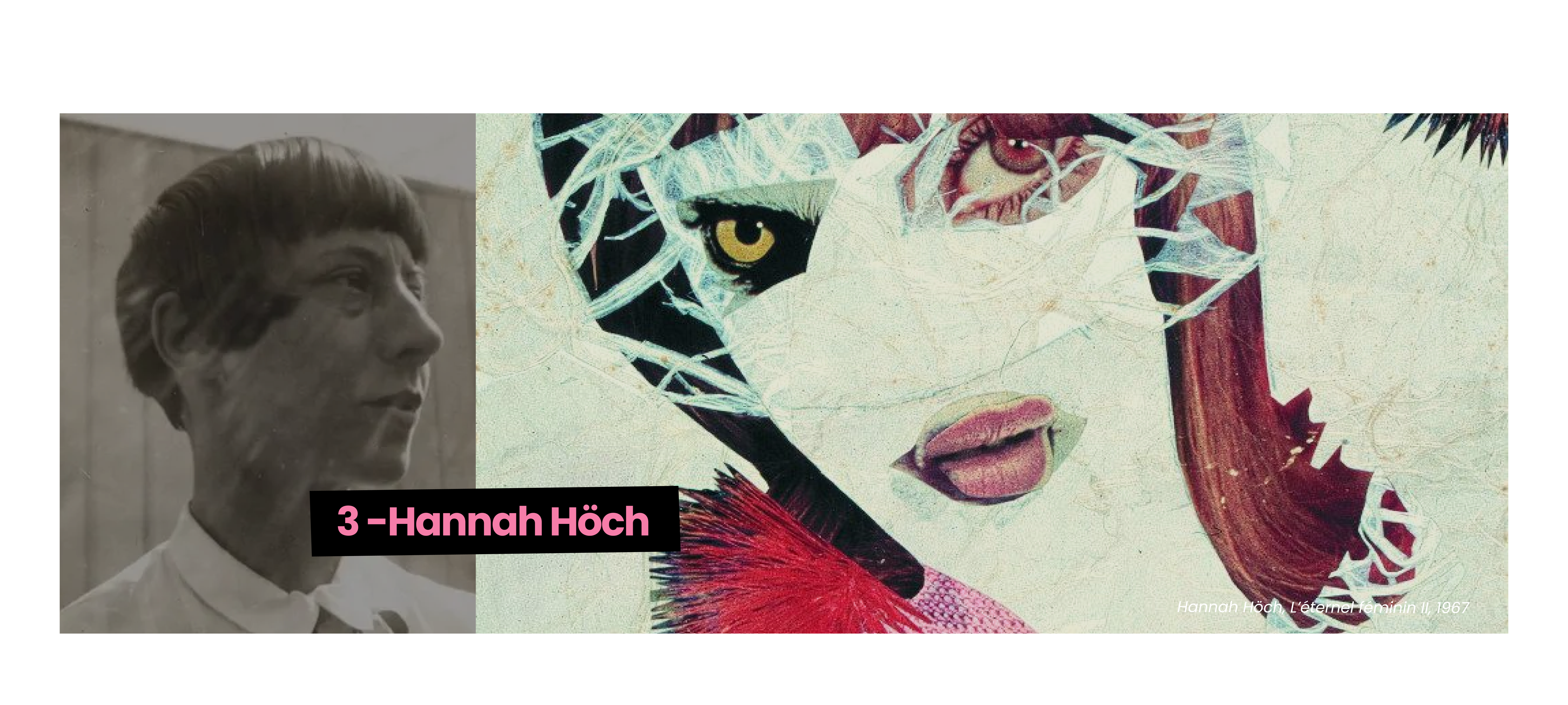 L’une des rares femmes du mouvement dada, Hannah Höch est une artiste allemande spécialisée dans le collage et le photomontage. À travers ses œuvres, elle reprend des images et des articles de journaux pour critiquer la politique de son pays. Elle s'interroge également sur le rôle de la femme dans la société, affichant sa volonté de rétablir l'égalité entre les sexes. Son travail traduit une quête de féminité moderne, en opposition aux canons esthétiques de son époque. En rejetant les conventions artistiques anciennes, Hannah Höch renouvelle la modernité dans un monde où les artistes femmes se multiplient et marquent l’art par leur audace.